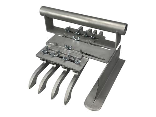 De GRS Snijklauw is speciaal ontwikkeld voor het nauwkeurig snijden van naden in sportvelden. Met de dubbele snijkanten wordt het kunstgras aan beide zijden gelijktijdig gesneden, waardoor een strakke en perfect aansluitende naad ontstaat. De klauw wordt eenvoudig tussen de tuftrijen geplaatst, zodat je altijd een stabiele geleiding hebt en de snede kaarsrecht blijft. Dit bespaart tijd, voorkomt scheef snijden en zorgt voor een professioneel resultaat bij iedere installatie.